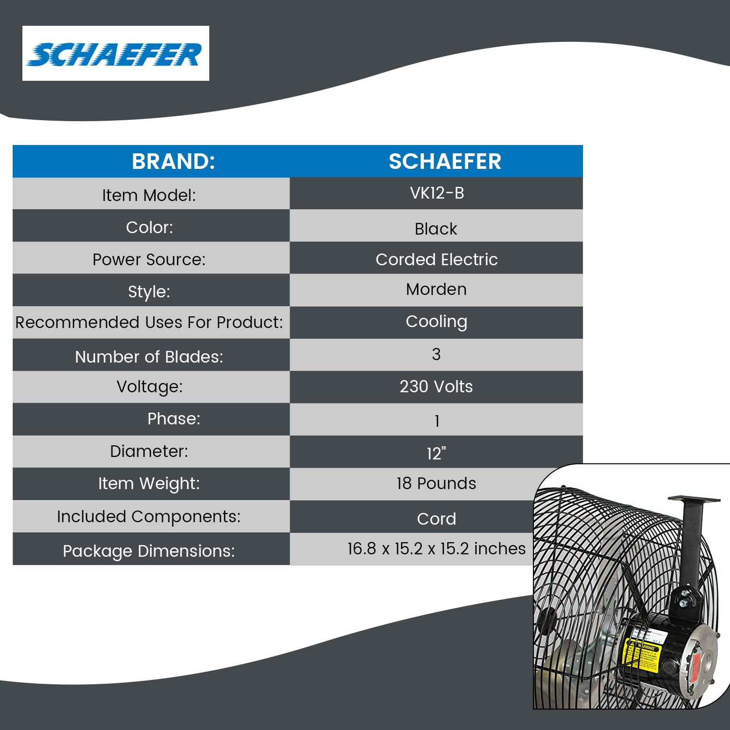 Schaefer VK12-B VersaKool Air Circulator Ceiling Wall Mount Greenhouse Fan & Aluminum Blade, 1470 CFM, 1/10 hp, Energy-Efficient Commercial Fan for Patio, Garage, Industrial & Workshop (Black)