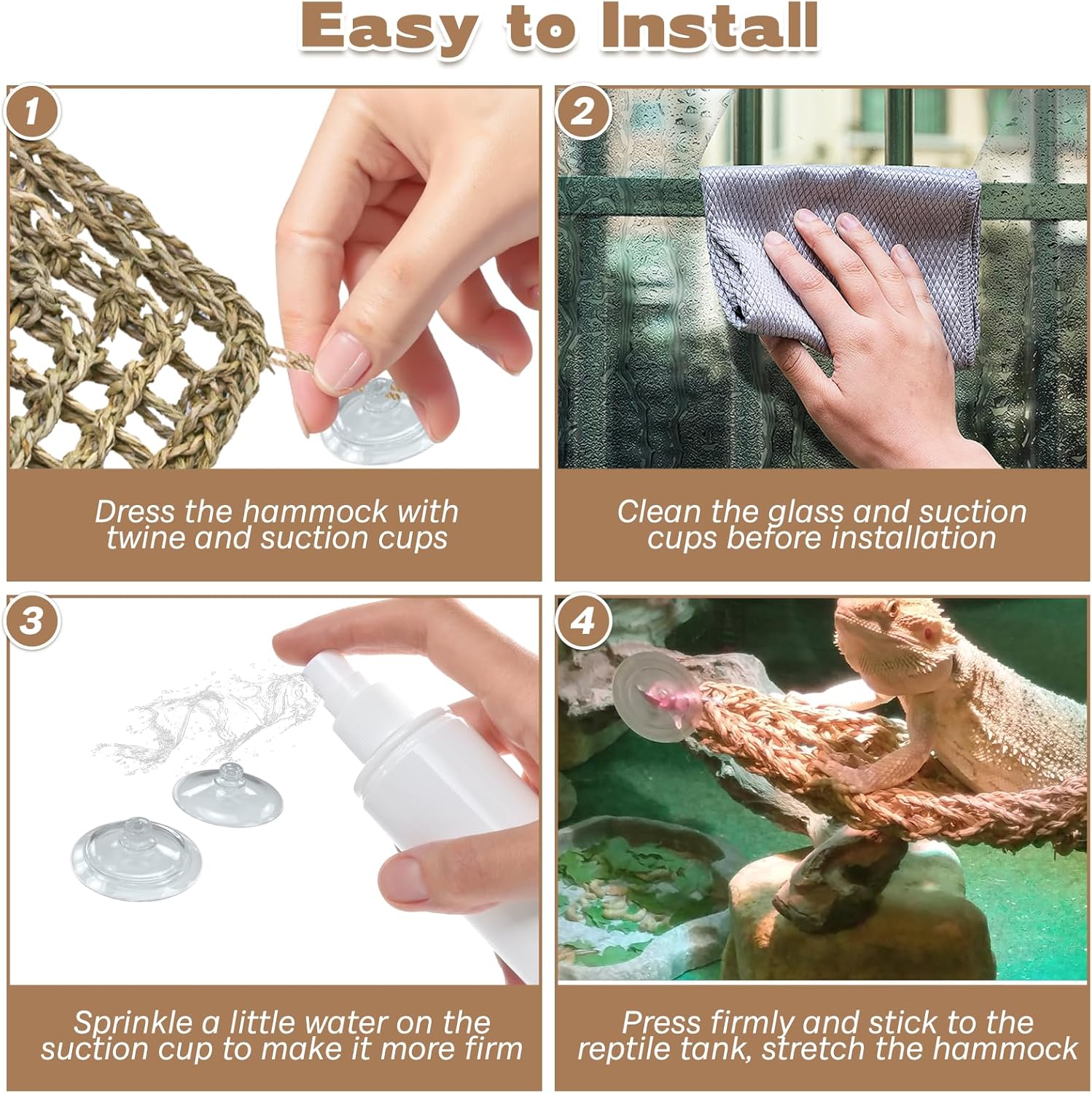 - Triangle seagrass bearded dragon hammock come with 4 strong, large suction cups and hemp rope to fix the reptile hammock to the tank, The lizard net hammock can be attached to the hammock for bearded dragon tank of glass, plastic or acrylic terrarium wall