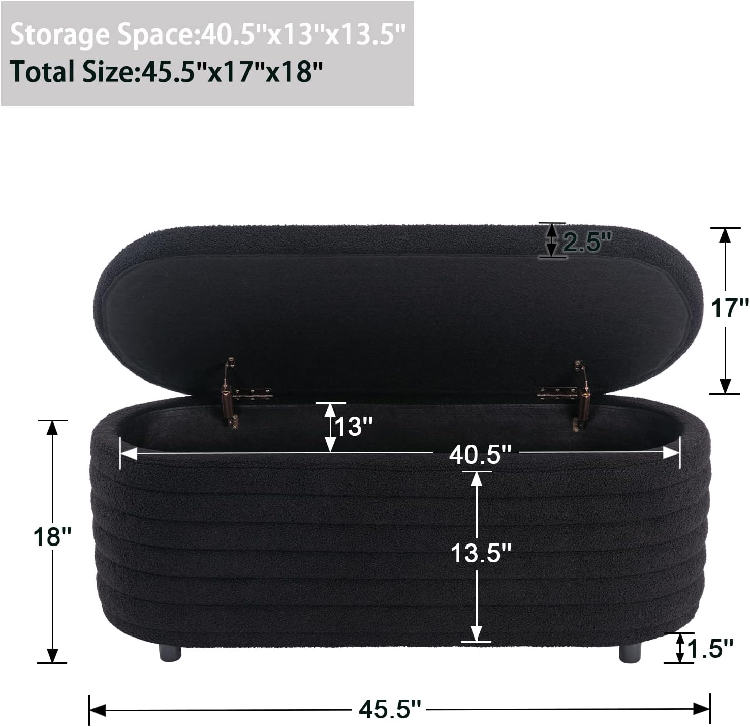 - STORAGE: Ideal for extra seating with its cushioned top, the ottoman also offers hidden storage for household objects.Padded hinged lid stays open for safe access to storage space inside. Overall Size: 45.5 "(L) x 17"(W) x 18 "(H), Storage inner size: 40.75"(L) x 13"(W) x 13.5"(H)