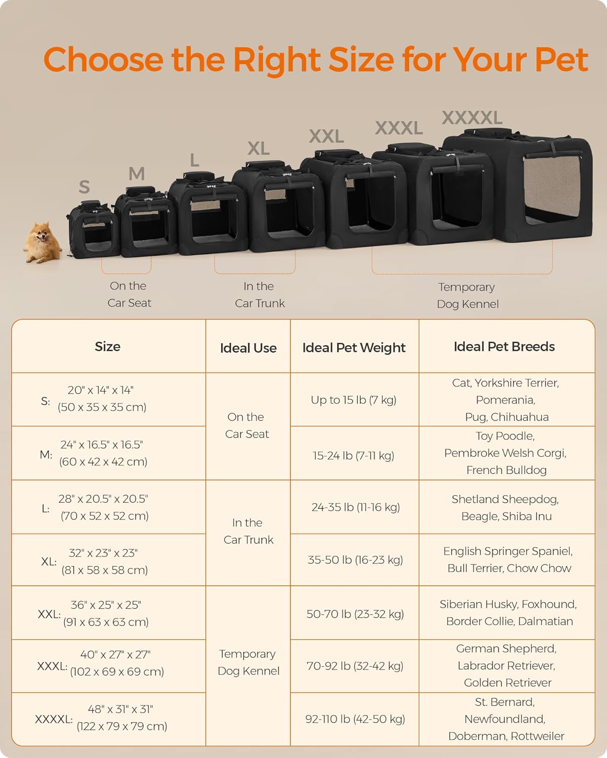 - 【CHOOSE THE RIGHT SIZE】This 28" x 20.5" x 20.5" collapsible dog carrier is ideal for pets between 24-35 lb. Please read our tips on the pictures to measure your pet and choose the right size