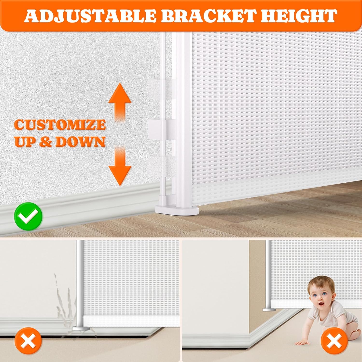 - Fit for Various Locations: Pawtners extra-wide baby gates are suitable for various locations in your home, including the kitchen, bedroom, living room, stairs, doorways, deck, porch, and more—indoors and outdoors. Our baby gate with door features an upgraded lower gate bracket that adjusts the height to accommodate various baseboard heights