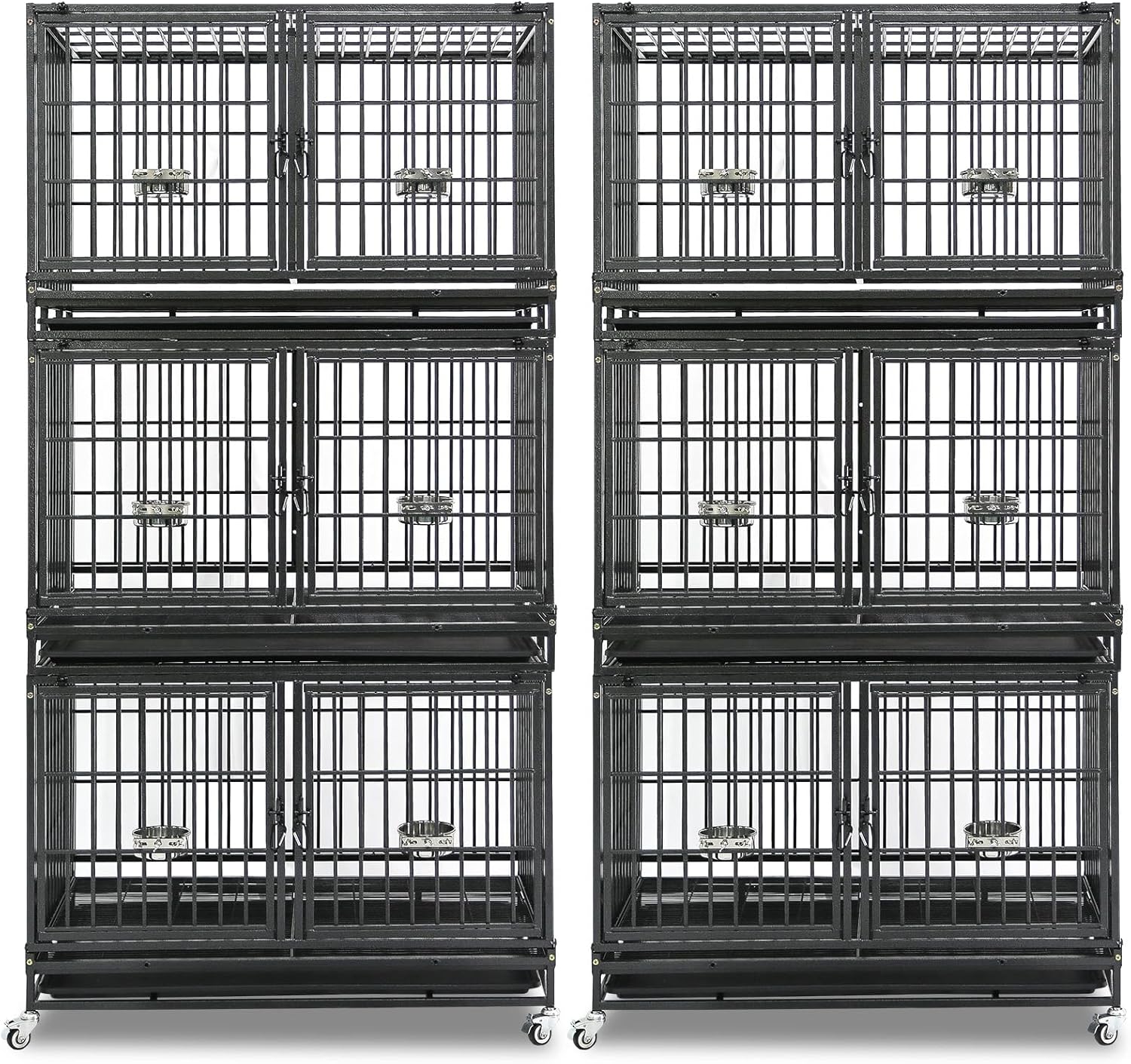 Homey Pet 2 Pack Three Tiers 43 inch Stackable Heavy Duty Dog Crate with Wheels, Indestructible Steel Dog Cage Kennel Indoor with Detachable Divider, Trays, Feeding Bowls, Escape Proof Locks