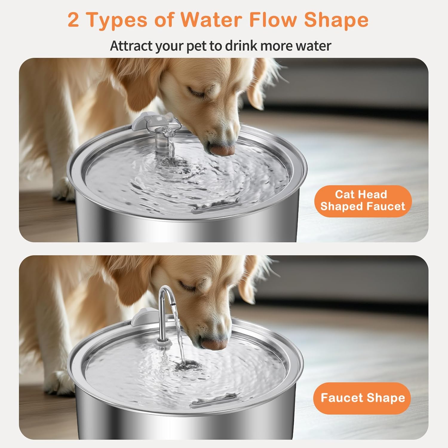- Dual Faucet Design Dog Fountain Water Bowl: This water fountain for dogs features two faucet options, allowing you to choose the one your pet prefers. The dynamic water flow catches their attention and encourages them to drink more, supporting their overall health and hydration.