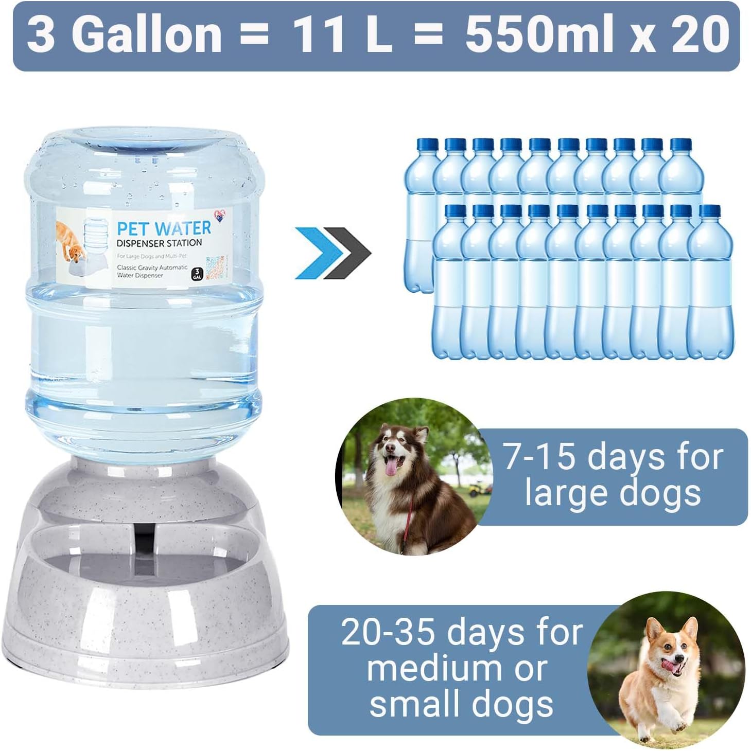 - 【3-Gallon Large Capacity Dog Water Bowl Dispenser】With an impressive 3-gallon water reservoir, this dispenser ensures your pet stays hydrated for up to 7-15 days. Ideal for large dogs, multi-pet households, and busy pet owners who want a worry-free hydration solution